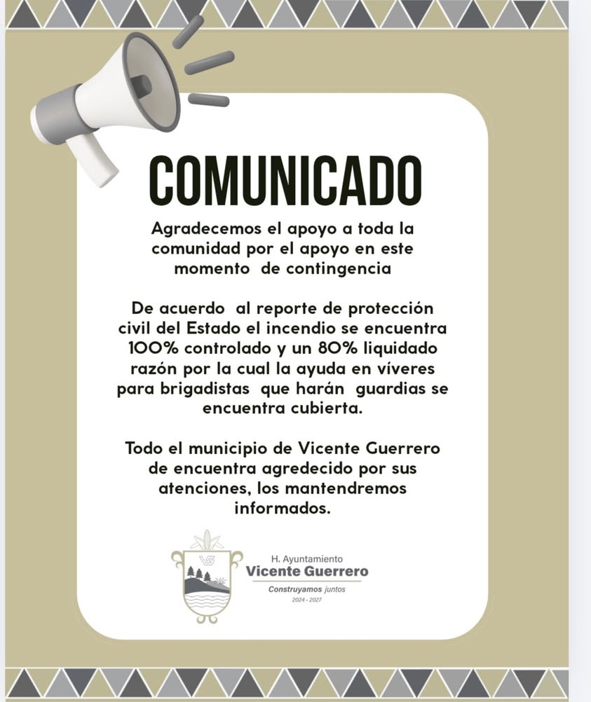 De acuerdo al reporte de protecci贸n civil del Estado el incendio se encuentra 100% controlado y un 80% liquidado raz贸n por la cual la ayuda en v铆veres para brigadistas que har谩n guardias se encuentra cubierta.馃憤